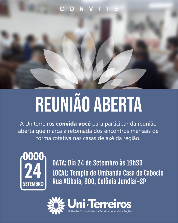 A Uniterreiros convida você para participar da reunião aberta que marca a retomada dos encontros mensais de forma rotativa nas casas de axé da região.